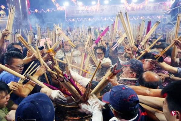 到了午夜12时前的10分钟,香客兴奋地一涌而上,围在金炉旁,还有人带领众信徒一起高喊“大 家‘发’啊!”等口号, 叫声此起彼落,全场气氛顿时沸腾起来。