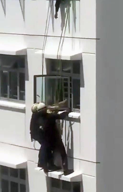 视频画面显示,两名民防人员在准备好后,从楼上单位一跃而下,落在阿叔的身旁,慢慢将他扶上窗沿,屋内同僚则接手把阿叔拉进单位。