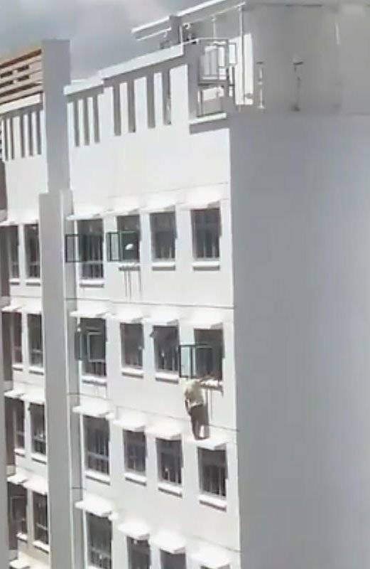 根据目击者拍下的视频,身穿浅色上衣和百慕大短裤的阿叔在烈阳下等待救援,时而双手紧抓窗花,时而松开一只手,时不时往下望。