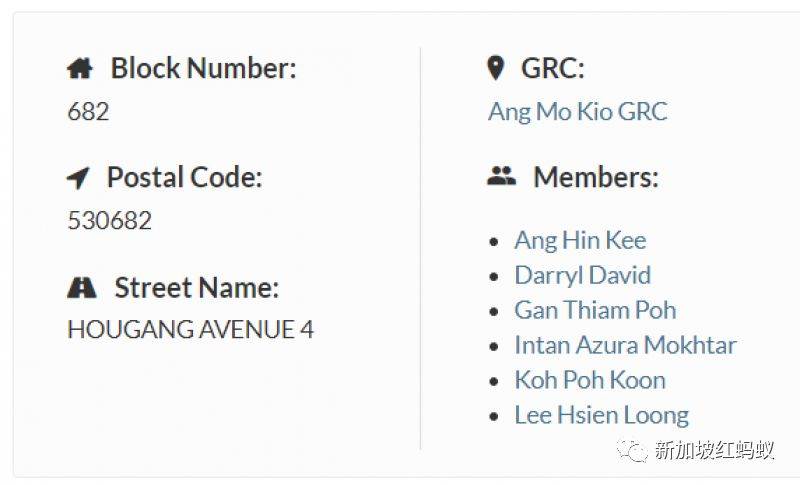 红蚂蚁上新加坡国会官网用Find My MP(查询我的议员是谁)功能输入“后港4巷大牌682号”的地址,结果出现以下查询结果: