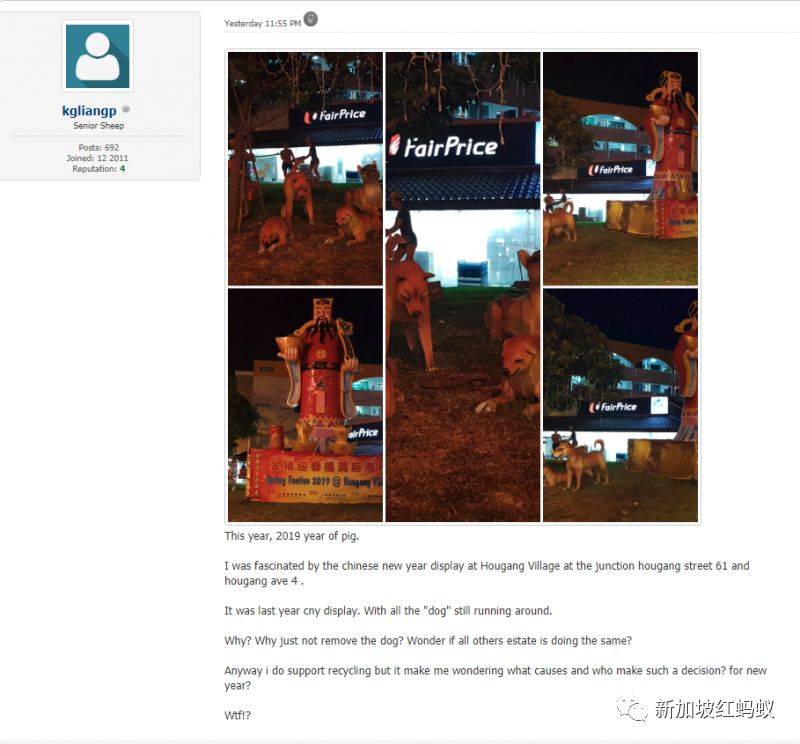 今年 —— 2019年是猪年。放置在后港61街和后港4巷的“后港村”新年装饰,让我闪瞎眼。这根本是去年的新年装饰。全都是“狗狗”在四处奔跑。为什么(会这样)?为何不干脆把狗除掉? 难道其他组屋区也采用同样做法?我其实是支持环保的。但我真的很好奇,这是为了什么原因,是谁在为新年做这样的决定? 搞什么东东!