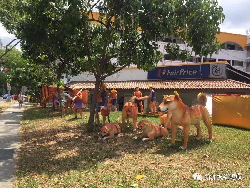 奇怪,这些“狗狗”越看越像牛车水的旧装饰。后面那些牛车和扛着锄具的人物也是“熟头熟脸”的,好像去年中秋节时曾出现在牛车水。(黄纯仪摄)