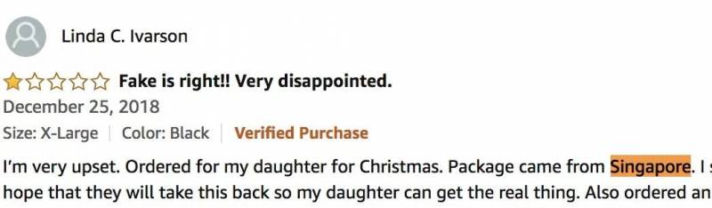 网友下单时,亚马逊上这家卖假羽绒服的店铺总共有3条评论,全是五星。几周后,这些评论几乎都降为1星。不止一个网友反映,这批来自新加坡的“加拿大鹅”是假的!