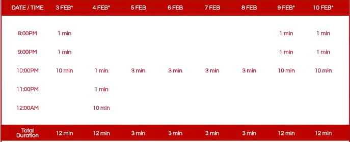 从2月3日开始,每晚都有烟花汇演可以观赏,但是在3日(廿九,开幕)、4日(三十)、9日(初五)、10日(初六、闭幕)这四天,有超长版烟花汇演1分钟+1分钟+10分钟的过瘾组合。
