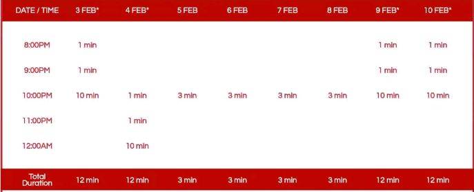 从2月3日开始,每晚都有烟花汇演可以观赏,但是在3日(廿九,开幕)、4日(三十)、9日(初五)、10日(初六、闭幕)这四天,有超长版烟花汇演1分钟+1分钟+10分钟的过瘾组合。