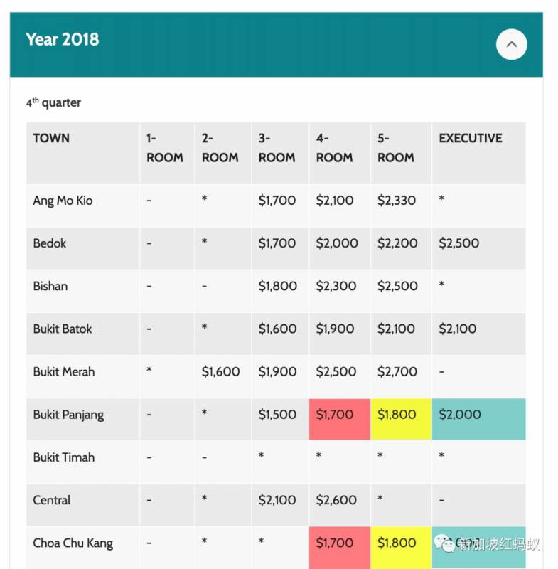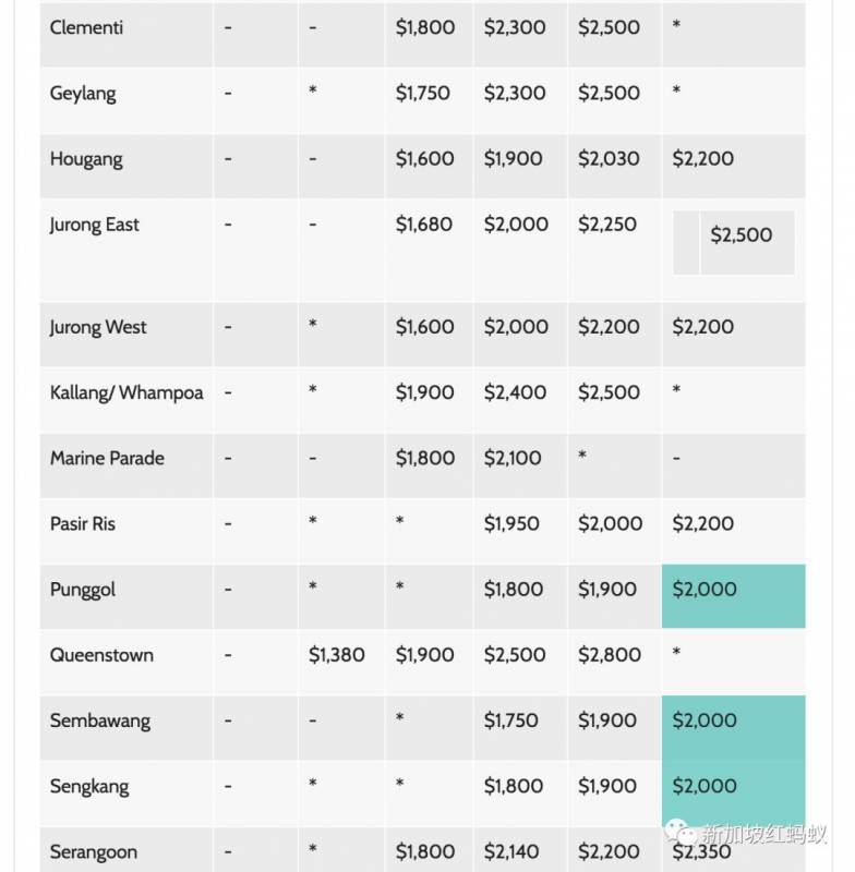 根据新加坡建屋局在官网上刊登的这份《2018年第四季度新加坡房租中位价》数据显示,三至五房式价格最低的出租房都集中在了北部和西北部,包括兀兰(Woodlands)、三巴旺(Sembawang )、蔡厝港(Choa Chu Kang ) 和武吉班让(Bukit Panjang)。