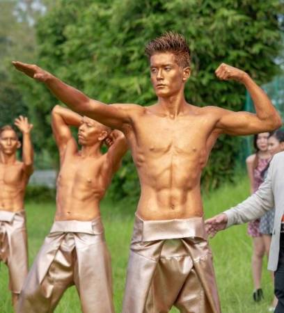 向洋在电影《女鬼爱上尸》里大展精瘦好身材,还“漆”上一身“金妆”