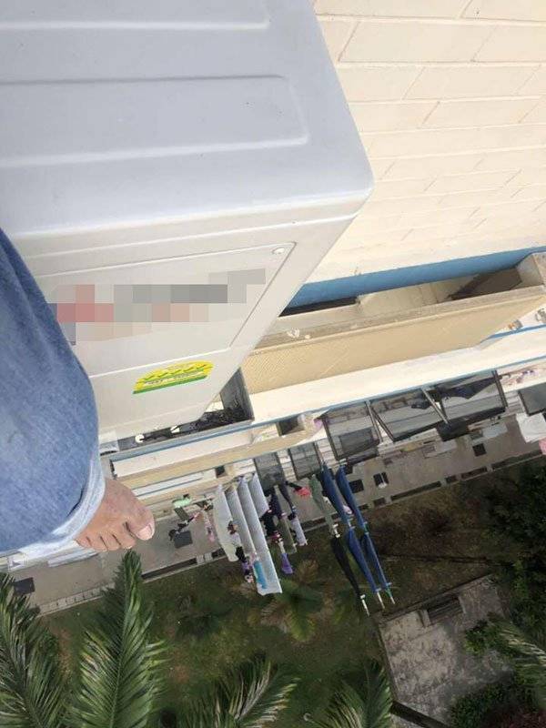 (新加坡10日讯)没戴头盔没系安全吊绳,冷气技工站组屋高楼窗外冷气架上拍照,声称为了证明冷气架够稳够牢固,行径让人看了冒冷汗,被批在玩命。