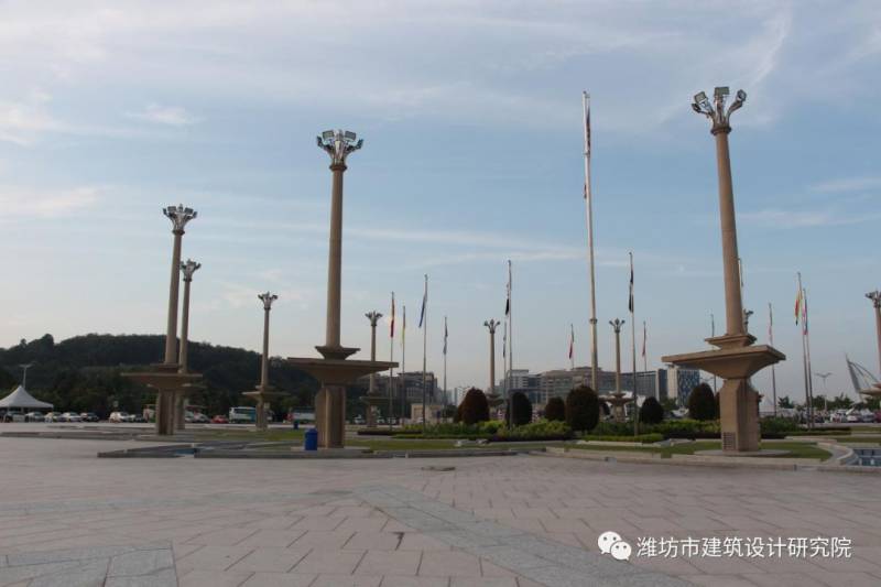 太子广场非常宽阔,中心有装饰著各色鲜花的喷水池,水池周围迎风飘扬的是代表马来西亚十四个州的旗帜。