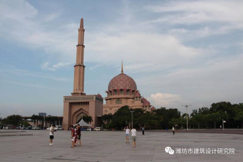 粉红色的水上清真寺在阳光的映射下,辉煌灿烂,蔚为壮观。粉红清真寺颜色相当柔美,大量使用玫瑰大理石建成。造型优美,其式样与装饰类似沙特阿拉伯麦加城的三大清真寺,主要由祈祷大厅、大尖塔和陵墓三部分组成。大厅的屋顶外观好似一把撑开的大伞,由49个大小圆拱组成。整个太子城给人的印象是:青山绿水,环境优美,身处此地,真是令人心旷神怡。