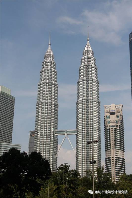 吉隆坡石油双塔是吉隆坡的知名地标及象征。由美国建筑设计师西萨·佩里(Cesar Pelli)设计。大楼表面大量使用了不锈钢与玻璃等材质。高452米,共地上88层,在两座主楼的41和42楼之间有一座长58.4米、距地面170米高的天桥。这座有人字形支架的桥像一座登天门。双塔的楼面构成以及其优雅的剪影给它们带来了独特的轮廓。其平面是两个扭转并重叠的正方形,用较小的圆形填补空缺;这种造型可以理解为来自伊斯兰的灵感,而同时又明显是现代的和西方的。