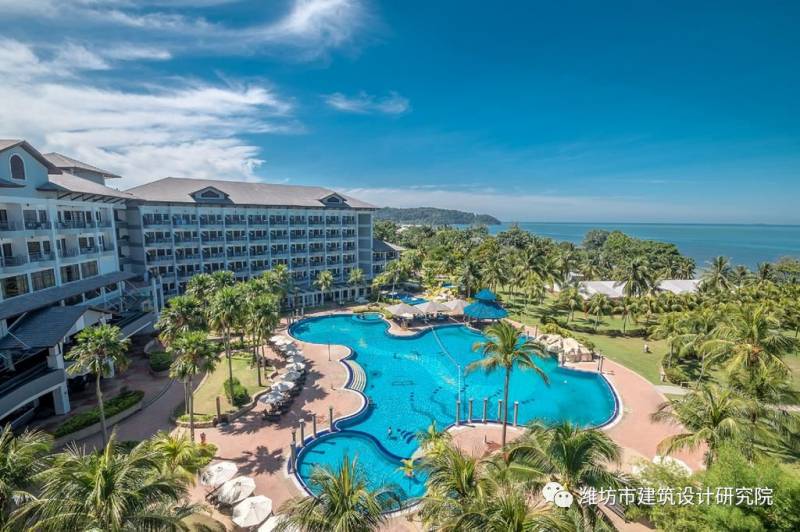 入住的酒店环境很不错,宛如坐落在一座绿色的小山丘上。v字型的酒店建筑布局围合著中心一个大的泳池,背后就是蔚蓝的天空和大海,搭配着热带翠绿色的灌木,给人的感受相当诗意。