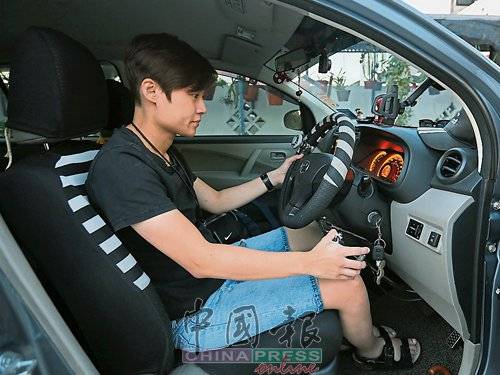 双脚不能踩油门就用手。沈茗卉示范操作改装的轿车。 认好友父母为干爸妈