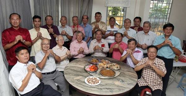 叶新田(前排左5)带领一众华教工作者拱手作揖,祝贺各界新年快乐;前排左起为叶全发、黎海洲、罗伯良、邹寿汉、刘天球、区永强和方山。