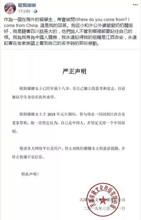 同时,她也亲自转发该份声明