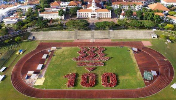 在新春佳节,华侨中学的约4500名师生穿上红色T恤,在华中钟楼前的大操场集合,排列出华中校徽和“100”字样的图形,以浩荡气势庆祝创校百年。