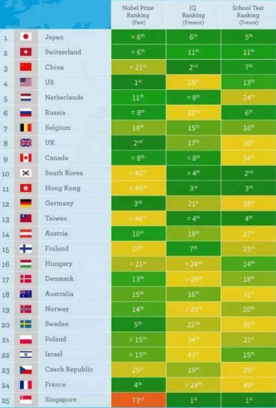 但是因为新加坡的诺贝尔奖获奖人数这一项排在了73名,因此尽管后两项排名排在了第一,在“全球最聪明国家与地区”榜单上新加坡只排在了25位~