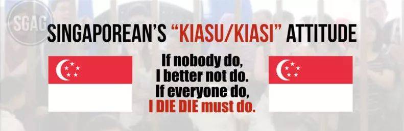 在新加坡式英语中有一个特殊的词汇用来形容新加坡人的另一种品质,那就是kiasu(源自福建话). 中文直接翻译过来,叫做怕输。怕输主要体现在两个方面,一个是新加坡人会非常的注重细节。比如说举办活动的时候,就会提前想好各种各样的突发情况,未雨绸缪。另一方面就是竞争心理比较强。新加坡有一个著名的叫做kiasuparent,我们在上面会经常看到各种各样的家长在上面发帖子。帖子的内容无非就是怎么被某某名校直接录取,怎么进入像牛剑、常青藤这样的国际一流大学等等。于此同时,新加坡家长也是非常在意校外的补习,使得新加坡的校外补习机构发展蓬勃。