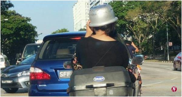 近日在多个社交媒体页面上流传一张照片,一名女子坐在摩哆后座,头上戴的“头盔”,细看之下才发现是饭锅。女子将电饭锅的内锅当摩哆头盔,在面子书页面ROADS.SG和SG Road Vigilante疯传,引发网友激烈的讨论,累积近3000次转载。