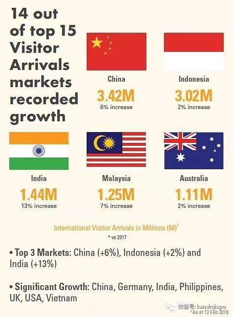 2018年大约有1850万外籍游客入境新加坡,比2017年的1740万增长了6.2%,中国游客达342万人次,是新加坡最大的客源国!前五名中还有澳大利亚、马来西亚、印尼和印度。