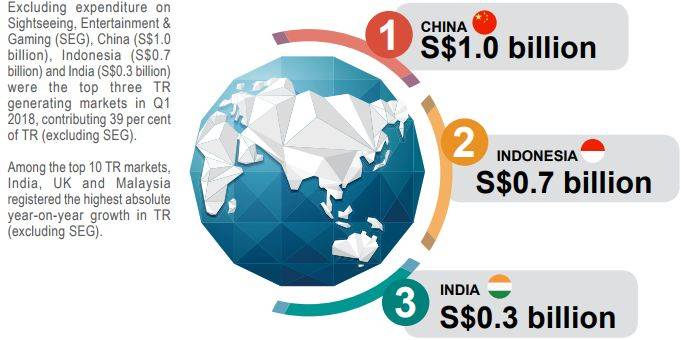 旅游局说,过去三年,新加坡旅游业收入持续增长,来看下2018年第一季度的旅游收入贡献榜,中国人贡献了10亿新币(约50亿人民币),第二名是印尼,第三名则是印度。