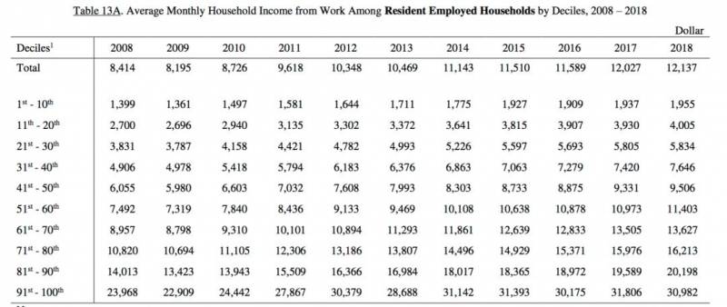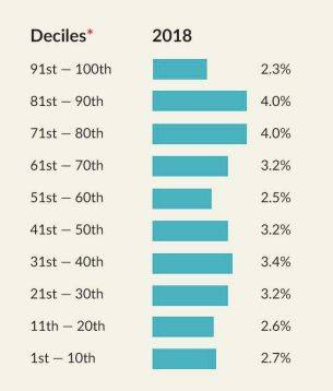 再来看看分段收入的增长表:从最高到最低收入人群,都有了2.3%到4.0%不等的增长。