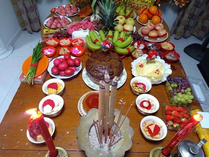 供桌上的发糕寓意发财,红龟粿寓意吉祥圆满,人丁兴旺,面线代表健康长寿。