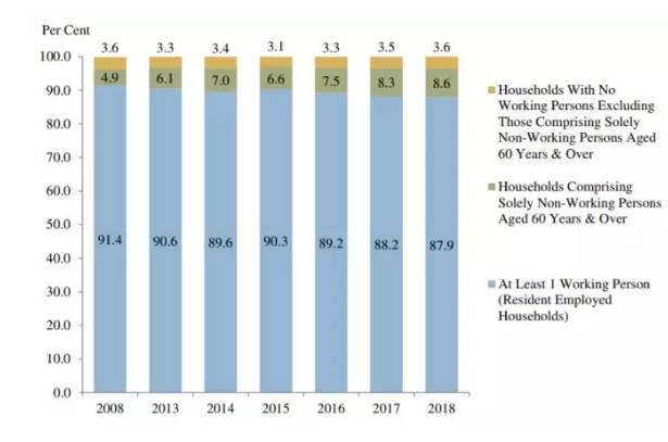 另一方面,数据显示由60岁以及60岁以上的非工作人士,所组成的本地住户比例从2008年的4.9%上升至去年8.6%