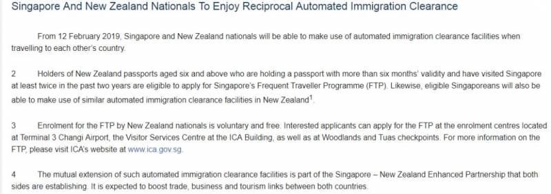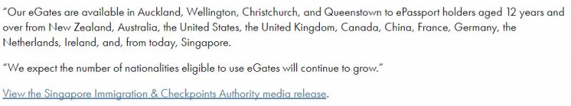 新加坡公民前往新西兰时,也可以使用相似系统入境,只是新西兰对护照持有者的年龄要求是12岁,和新加坡要求的6岁有些区别,而且仅限通过新西兰的奥克兰、威灵顿、基督城、皇后镇四个口岸入关。