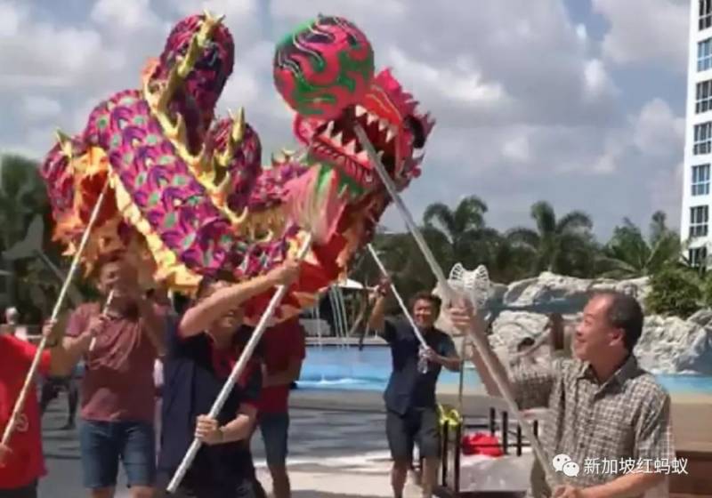 61岁的刘程强在视频中手握龙珠绣球,一边转动绣球,一边频频回望“龙头”,然后半引诱导、半耍弄地跟着喧闹锣鼓声的节拍将龙珠放低后再提高。彩龙就这样兴高采烈地追逐著龙珠绣球,在私人公寓的泳池旁生硬地舞动起来。别问红蚂蚁为什么是舞龙而不是舞狮?聪明的蚁粉自己想想吧。
