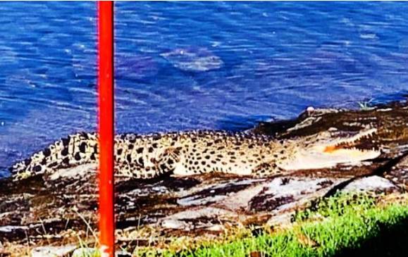昨天,一网友在在胡姬乡村俱乐部高尔夫球场潇洒时,居然发现了一只鳄鱼...惊的球杆差点扔过去...