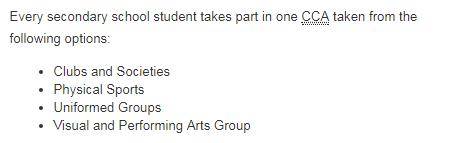 新加坡小学及初中,一般只上半天课,之后是CCA(Co-Curricular Activities)的时间,所谓CCA,也就是我们常说的兴趣辅助课程,和国内的兴趣班不同的是,CCA意在培养孩子的价值观和生活技能,目的是让每个孩子有能力应对今后生活的困难和挑战。