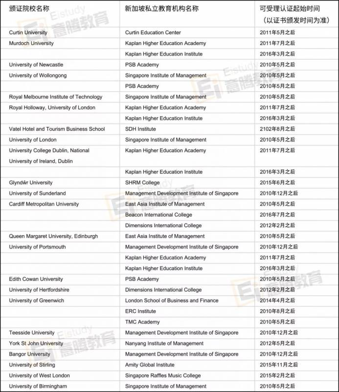 由于新加坡此类私立教育机构数量较多,颁发第三国文凭证书的情况较为复杂,为保护留学人员利益,我中心在与颁证机构建立沟通,充分了解其在新加坡的办学及合作情况,并建立有效核查渠道后,已将下列符合条件的文凭证书纳入认证范围(持续更新):