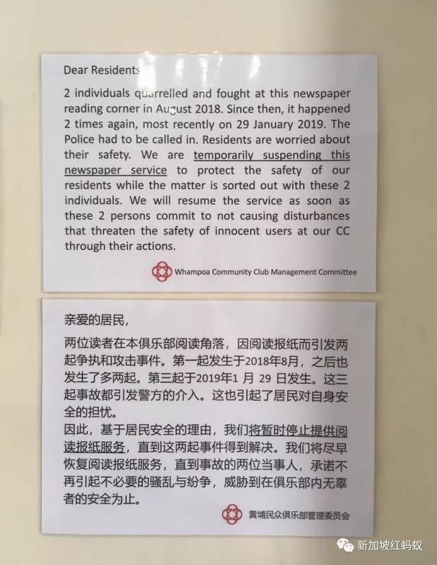 住在黄埔附近又爱看报纸的蚁粉,最近到黄埔民众俱乐部应该都找不到报纸看了。这是因为新年前那里有公众看报纸看到吵架还动手打人,搞到警察都要上门处理,民众俱乐部为确保大家的安全,决定暂停提供阅读报纸服务,并贴出以下这张中英文通告告知公众。