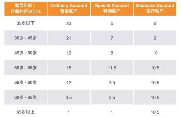 每个月需要存多少到CPF呢?来看一下一下这个表格(月薪6000新币就封顶啦,政府企业的比例与下表不同)