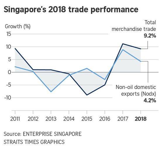新加坡的贸易和出口增长在2018年有所放缓,主要贸易促进机构新加坡国际企业发展局ENTERPRISE SINGAPORE预测2019年的非石油国内出口(NODX)和商品贸易总额将维持在0至2.0%,去年总贸易额超过1万亿新元。