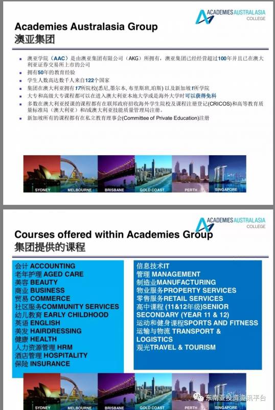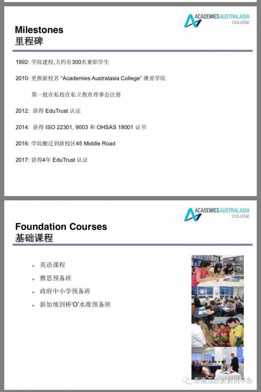澳亚学院 Academies Australasia College 上市公司为雪梨澳亚集团在新加坡的分校,澳亚集团作为全球的知名教育品牌,已有超过100年的历史并在澳大利亚上市。澳亚学院(原名:华盛顿学院)于1992年在新加坡成立,拥有20余年的教育经验,已经培育 了来自全球的20多个国家近万名优秀学生。澳亚学院 所提供的各种课程在在于理论和实践相结合,学生在学习必要的理论知识的同时也得到充分的实际应用能力,以以后的深造和就业打下坚实的基础。