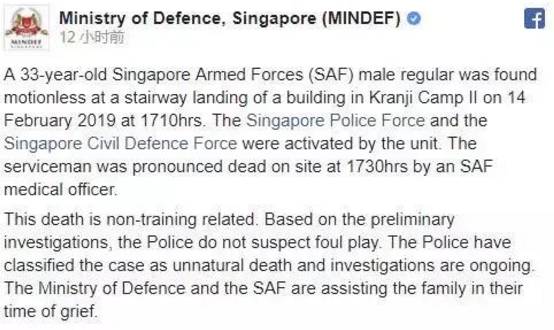 2019年2月14日的下午5点10分发现一名33岁的新加坡武装部队(SAF)正规军人倒卧在kranji II 军营。