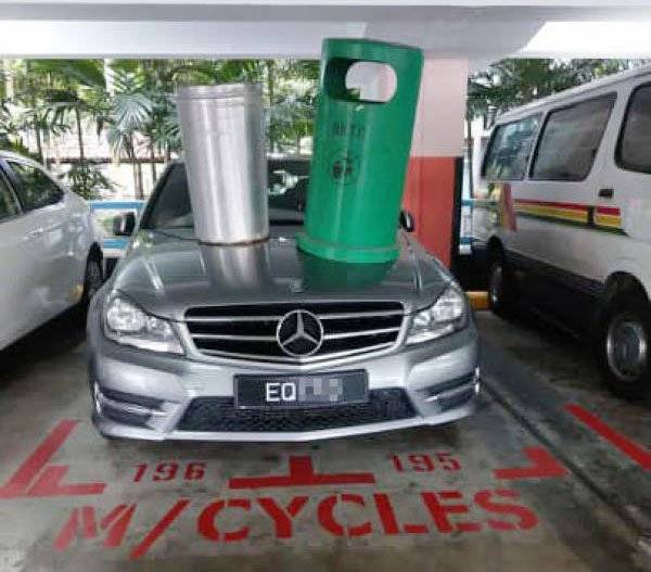这辆马赛地相信是因为霸占了两个摩哆车位,引人不满,有人就把两个垃圾桶放在马赛地的引擎盖上。
