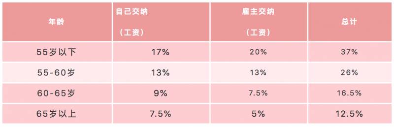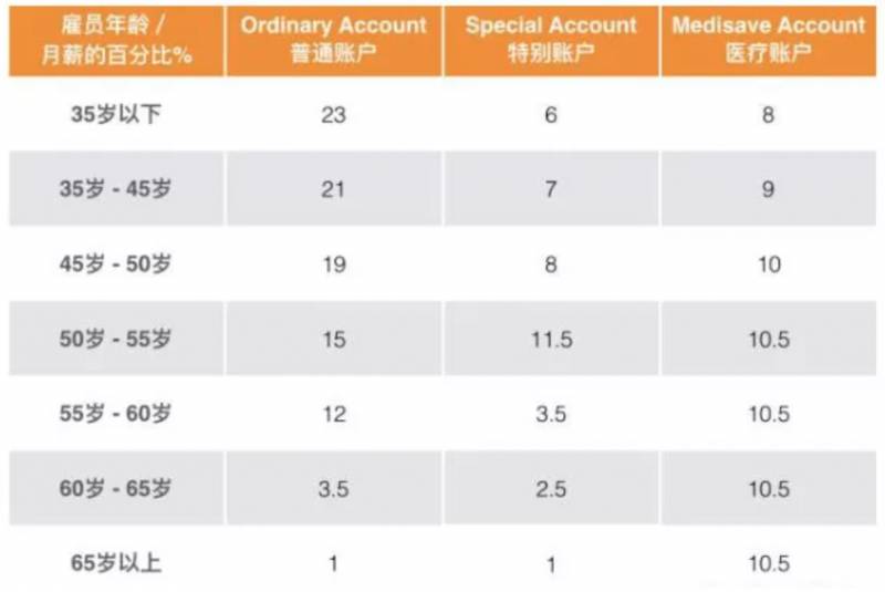 每个月需要存多少到CPF呢?来看一下一下这个表格(月薪6000新币就封顶啦,政府企业的比例与下表不同)