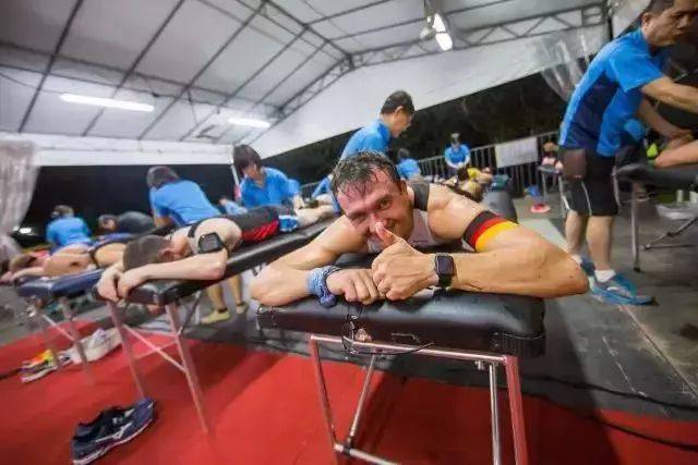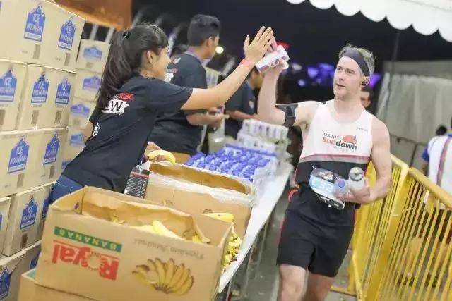 新加坡非常湿热,哪怕在凌晨,气温仍在30℃左右,空气湿度甚至高达90%,比赛主办方考虑周全,全程设有多个水站,亦有能量Gel、香蕉等提供。即使是8小时的关门型选手也不必担心渴着或者饿著。从天黑到天亮,这水杯里永远盛着足够量的水和饮料等待路过的选手,不管路过的选手有多少,志愿者们都会在那等待你的到来。全程选手到终点后可以淋浴和享受免费按摩。