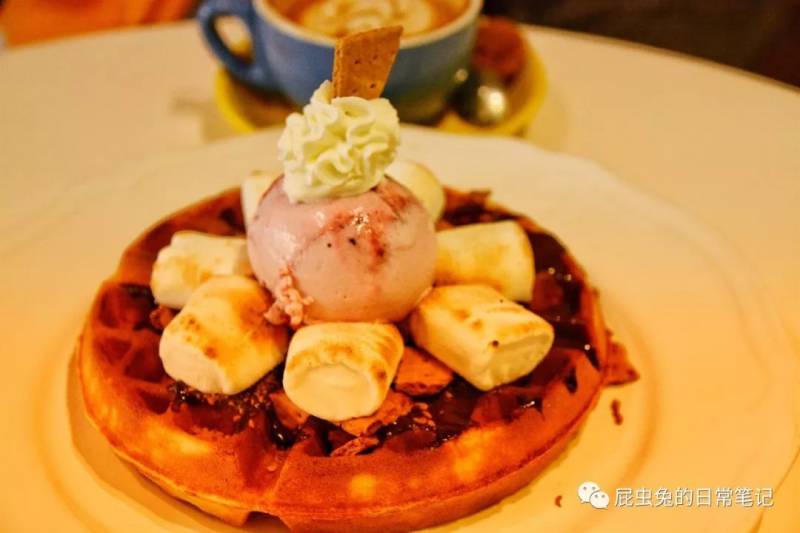 这份Waffles底胚非常厚,属于整体都比较脆硬的那种,不同于我们手上拿着吃的那种华夫饼。