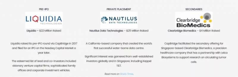 Capbridge的前身是一个新加坡的众筹平台,有多年的服务专业投资人和风险投资项目的经验。Capbridge的团队和新加坡银行、星展银行等银行的私人银行平台有合作关系,是其平台为早期项目实现融资的一个重要渠道。