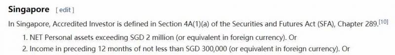 新加坡对于专业投资人的定义为2百万新币净资产(含1百万新币的房产),或者过去12个月收入达到30万新币。