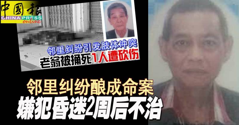 (怡保16日讯)邻里纠纷引发争执,华裔老翁遭邻居以利器捅死案;以利器捅死老翁的嫌犯,入院昏迷近2个星期后,今日因伤势恶化而不治。