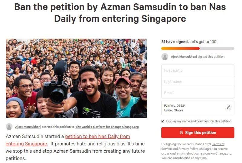 “禁止Azman Samsudin禁止Nas Daily进入新加坡的请愿书”。