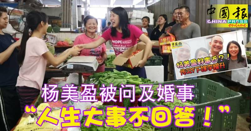 能源、科技、科学、气候变化和环境部长杨美盈对于外传,将于3月29日与IOI产业集团总执行长李耀升低调大婚,今早杨美盈到麻坡大巴刹派年柑,当媒体询及此事时,她仅是笑着给应,并转身离开。