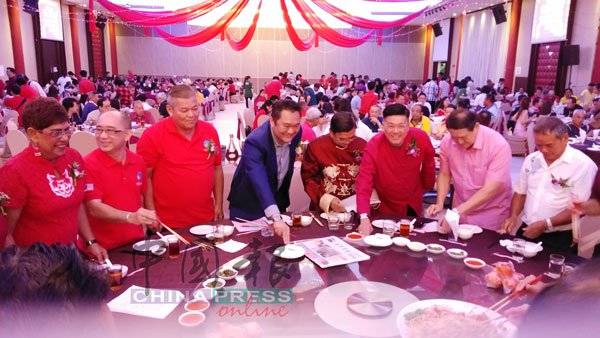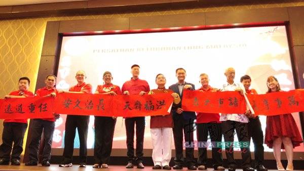 嘉宾齐向与会者用春联拜年,左4起是玛丽约瑟芬、洪来喜、林振辉、龙经业等。