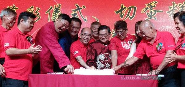 马来西亚龙氏公会3岁了!嘉宾一起切蛋糕庆祝,左起是龙仕兴、洪来喜、林振辉、龙田俊、龙国强、玛丽约瑟芬和梁耀雯等。