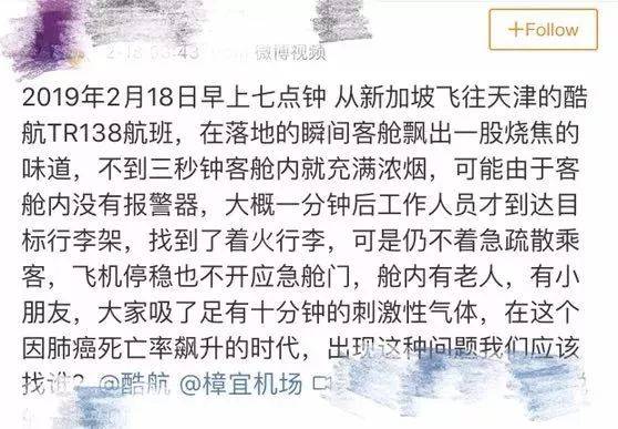 新加坡眼第一时间联系了酷航,并得到了答复:在今天早上TR138次航班在落地滑行阶段,机舱行李架上确实有烟飘出,很有可能是某位乘客带上飞机的充电宝所致。